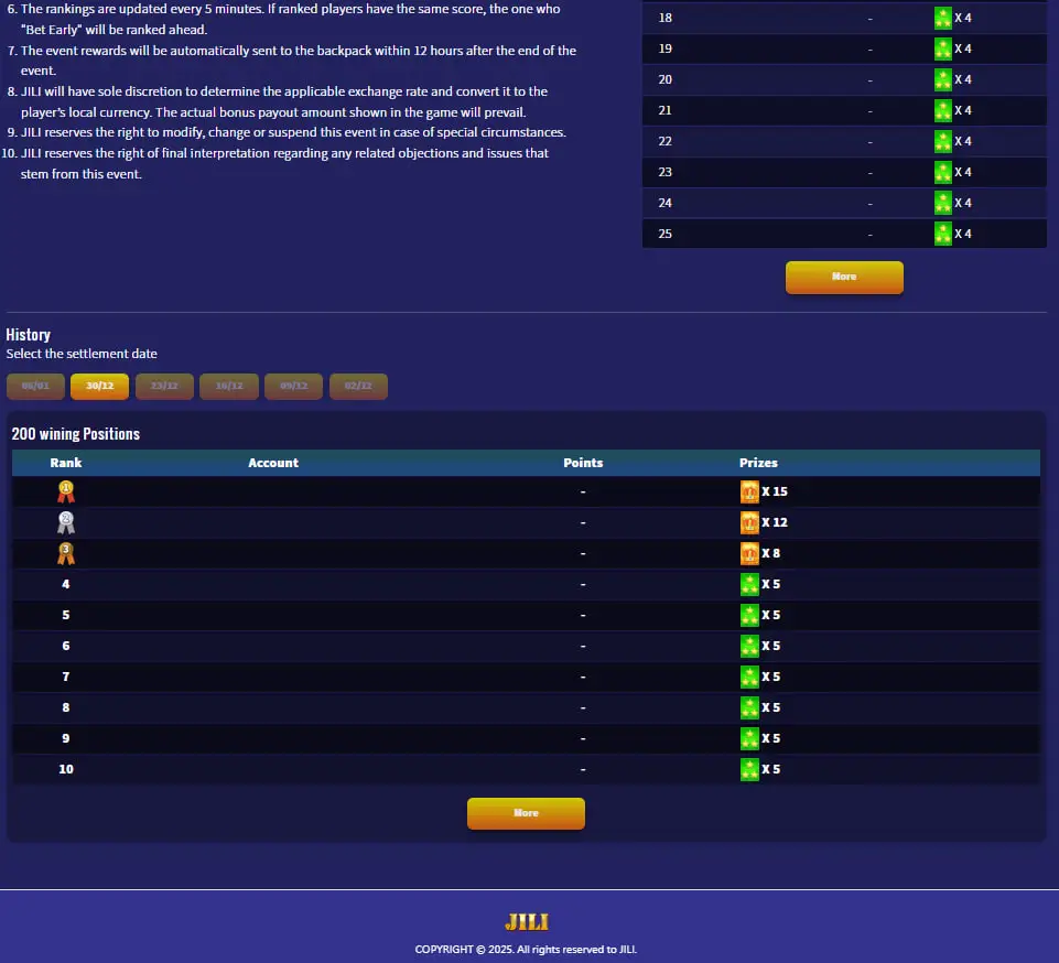 1. Ranking period of the day is 00:00:00~23:59:59 and the highest amounts for a specified period of time is a daily winner.