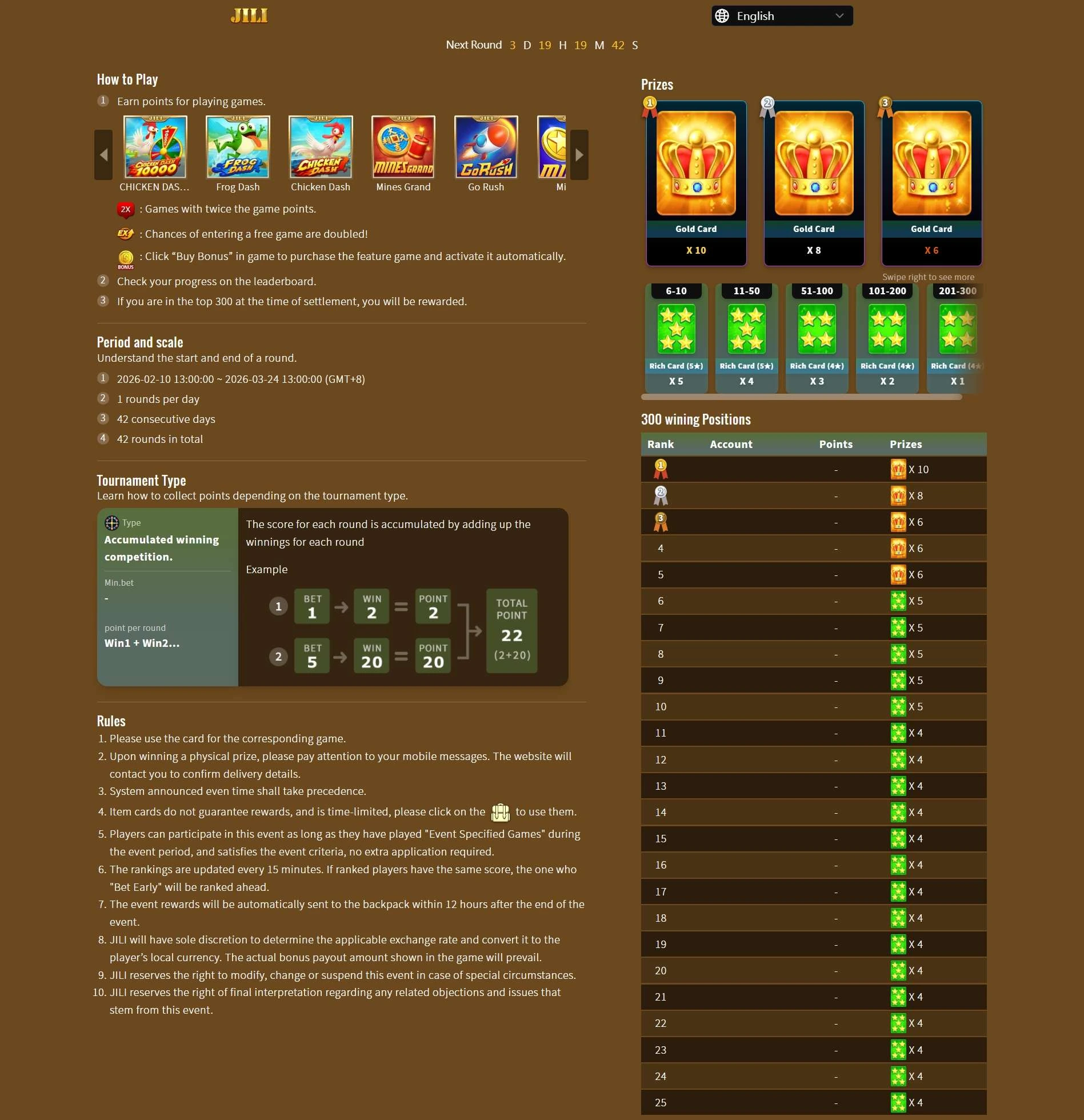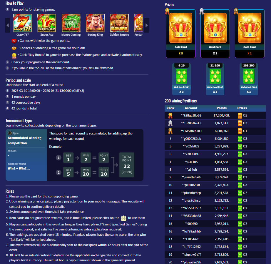 2. Ranking period of the day is 00:00:00~23:59:59 and the highest amounts for a specified period of time is a daily winner.