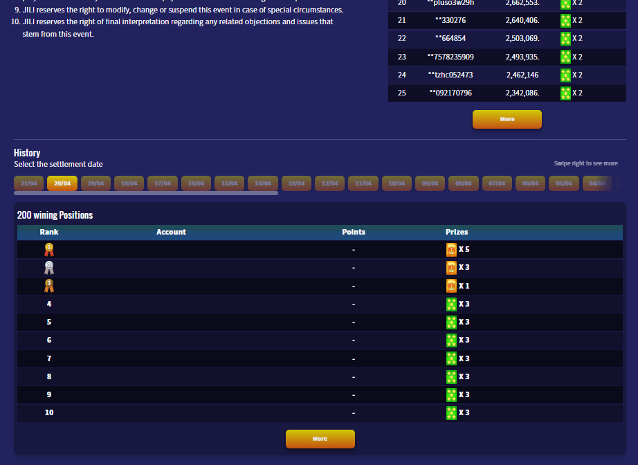 1. Ranking period of the day is 00:00:00~23:59:59 and the highest amounts for a specified period of time is a daily winner.