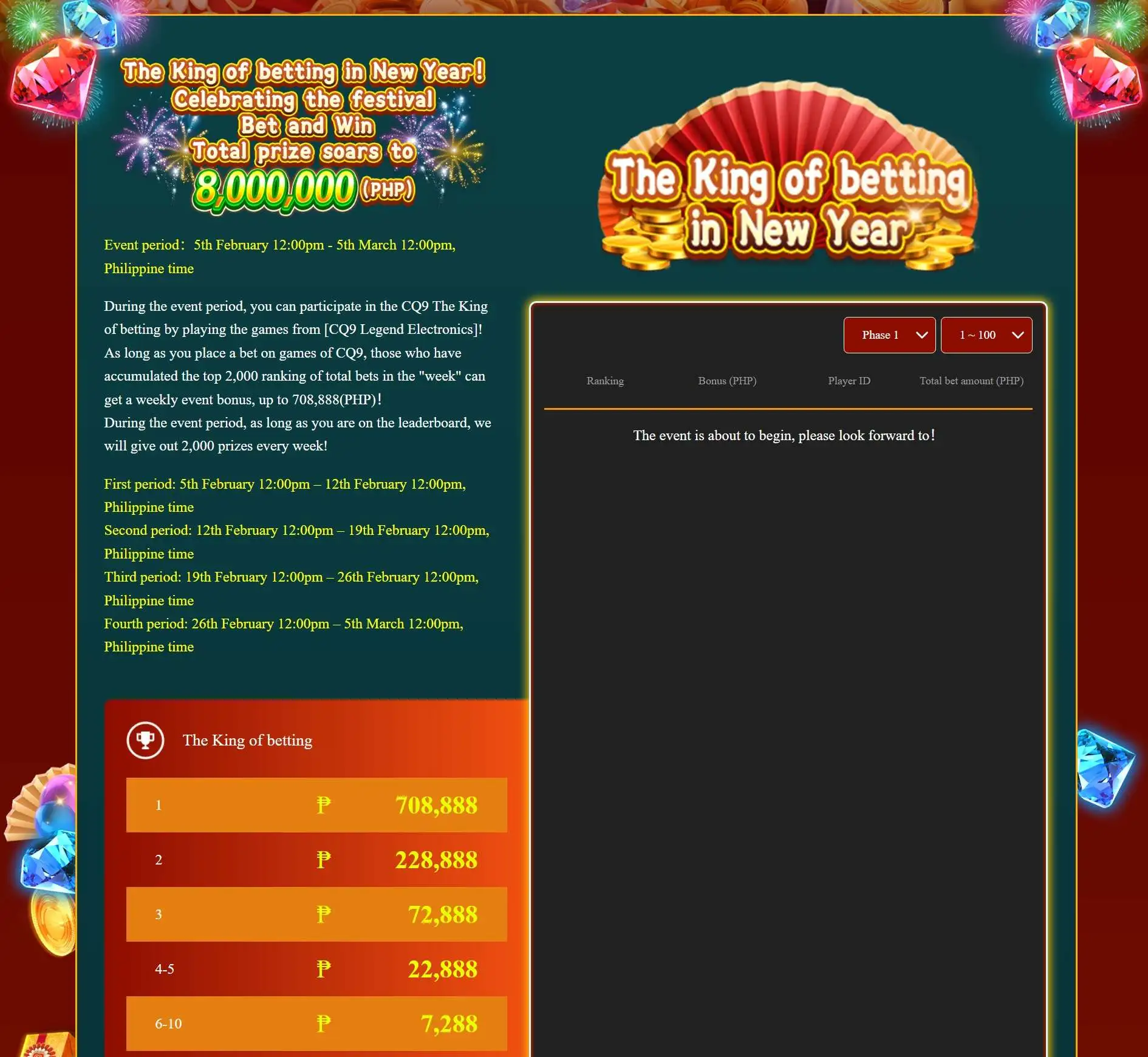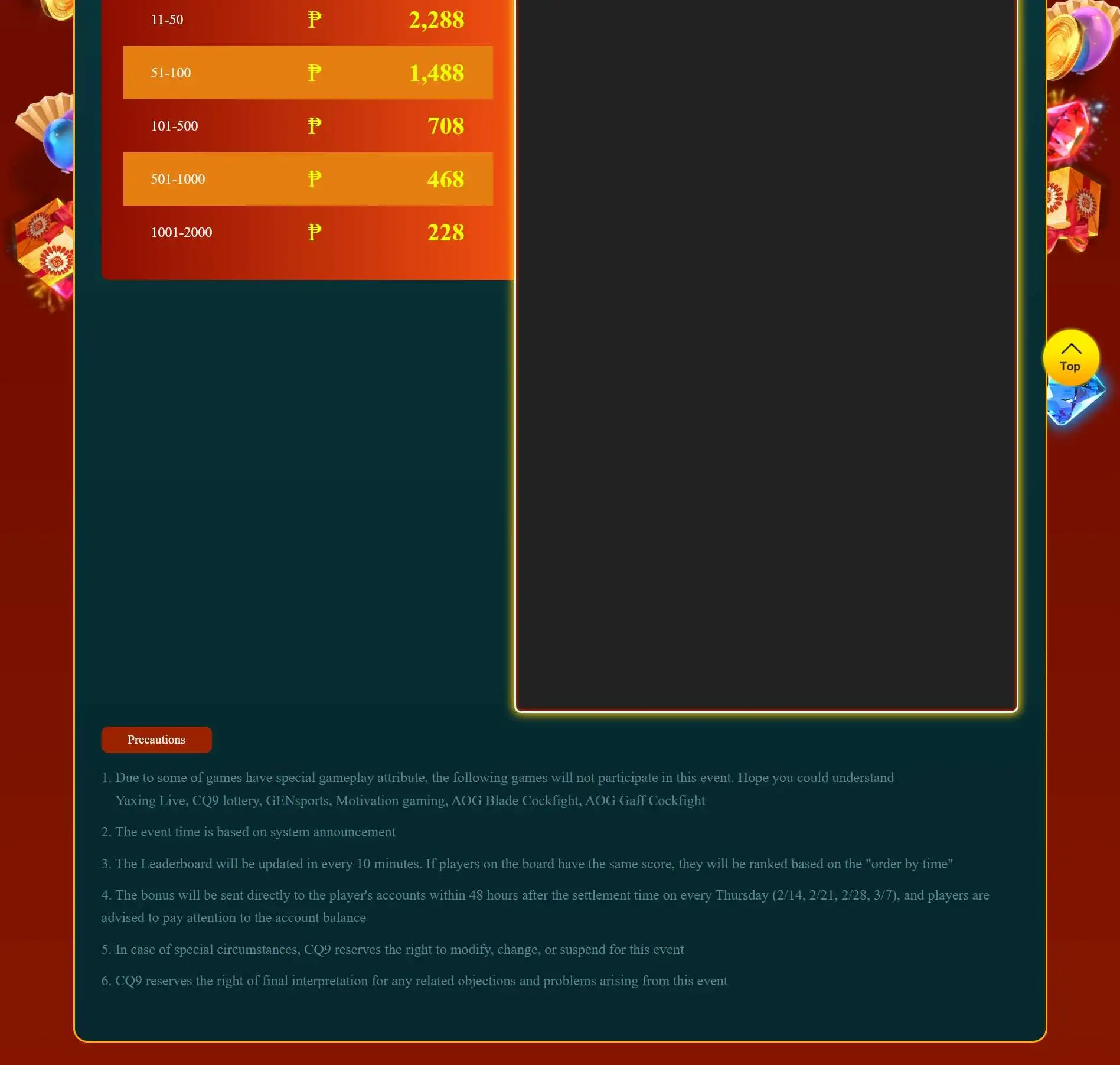 2. Ranking period of the day is 00:00:00~23:59:59 and the highest amounts for a specified period of time is a daily winner.